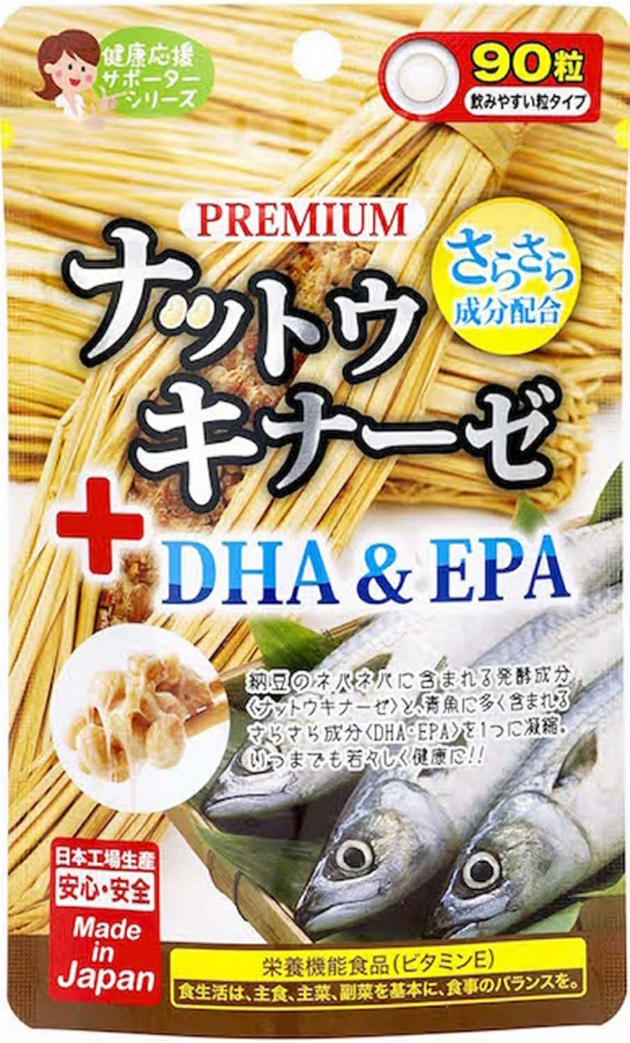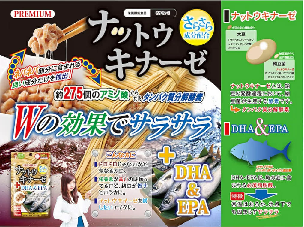 Premium Natto Kinase + DHA & EPA нь наттоноос гаралтай наттокиназа фермент болон загасны тосны найрлагад агуулагддаг DHA, EPA-г хослуулсан нэмэлт бүтээгдэхүүн юм. Мөн витамин E агуулсан тул өдөр тутмын хооллолтыг дэмжих зорилгоор хэрэглэж болно. Уухад хялбар шахмал хэлбэртэй, 90 ширхэгтэй савлагаа бөгөөд Японд үйлдвэрлэгдсэн.